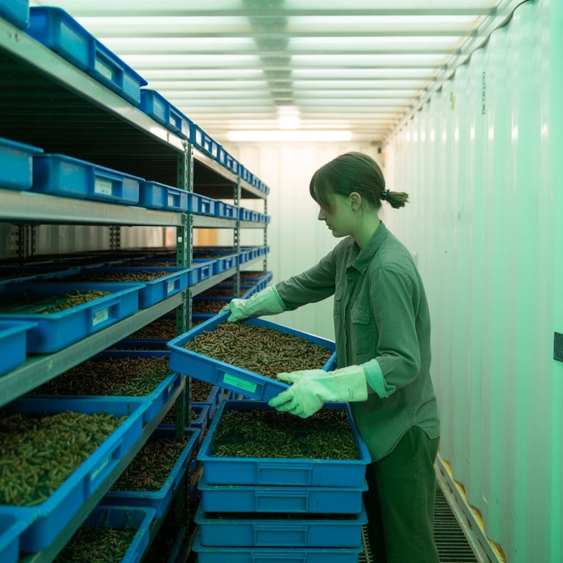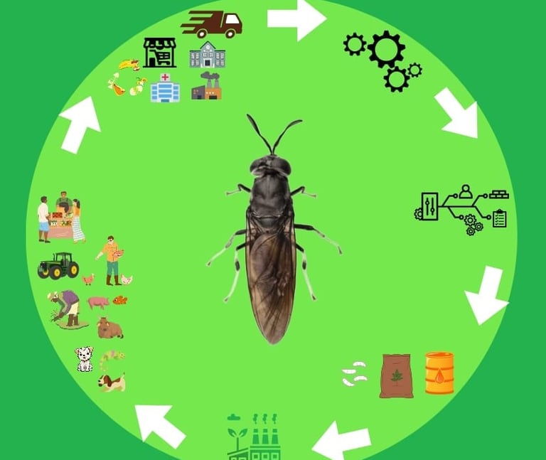 Processo inovador que utiliza larvas da mosca-soldado-negro (Hermetia illucens) para decompor resíduos orgânicos de forma acelerada, segura e sem odores.